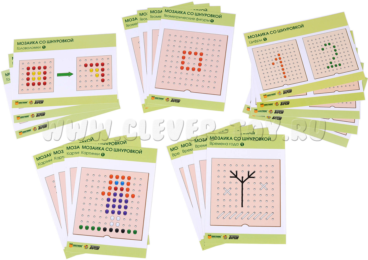 Комплектация: планшет 25*25 см – 1 шт., фишки – 120 шт. (по 15 шт. 8 цветов), шнурки разноцветные – 8 шт., опорные карточки – 20 шт., кубик игральный – 1 шт., руководство по эксплуатации – 1 шт.