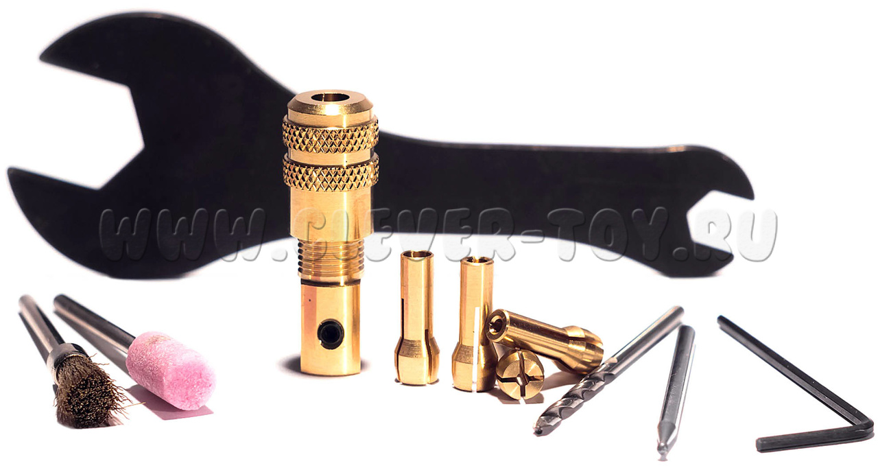 Переходник из данного комплекта позволяет крепить гибкий вал к станку PlayMake. Насадки можно использовать либо в режиме сверлильного станка, либо с гибким валом.