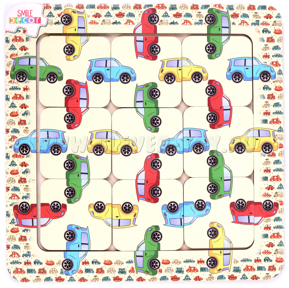 2. Игра "Автослесарь". Достаньте несколько элементов головоломки из рамки-основания. Предложите ребенку вставить квадраты обратно в рамку так, чтобы половинки машинок (капот и багажник) соответствовали друг другу по цвету.  Если ребенок легко справляется с заданием, то извлеките все элементы и попросите собрать машинки в автомастерской.