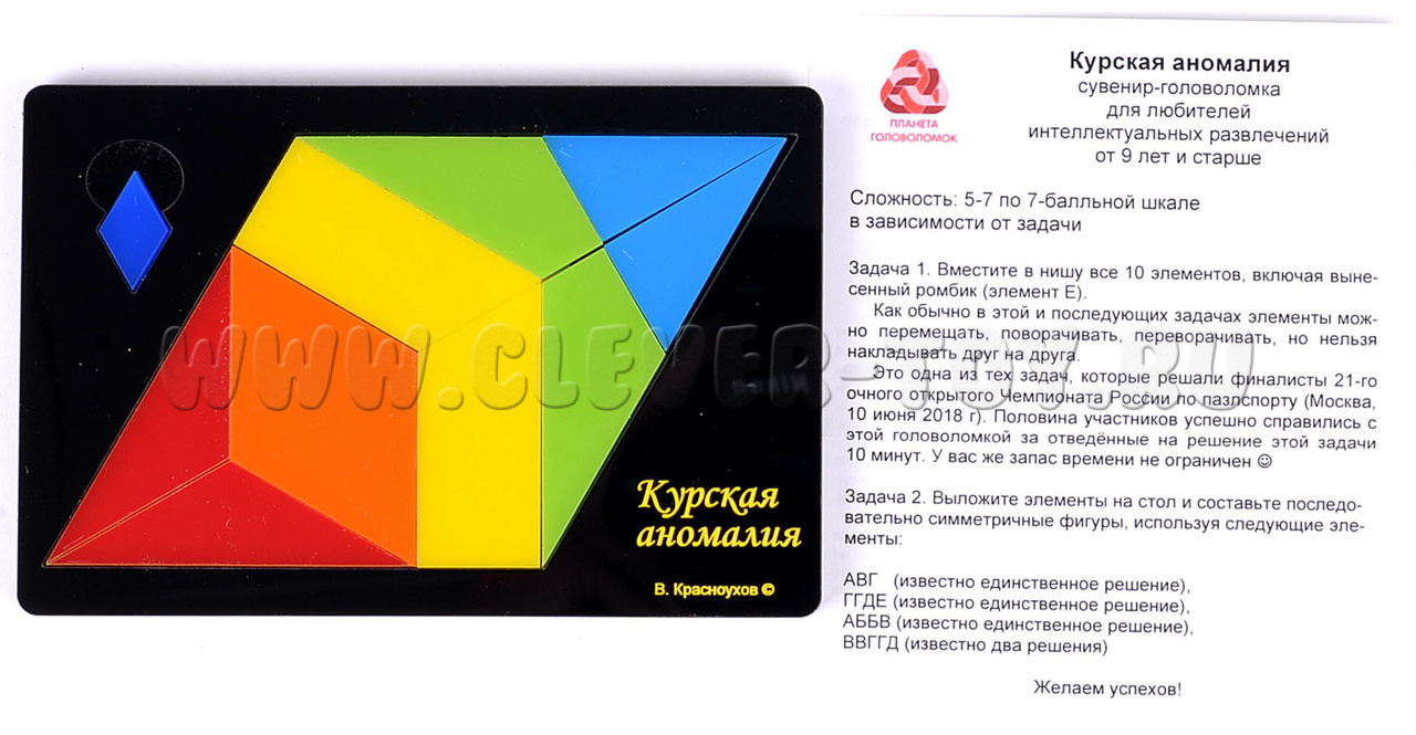 Головоломка состоит из набора игровых элементов и корпуса с ромбовидной нишей. Первые 9 элементов набора легко укладываются в нишу, при этом элементы заполняют практически всю площадь ниши, и для последнего (десятого) элемента места в нише не остается.