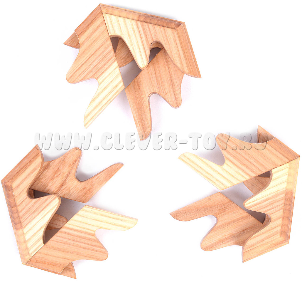 Если положить эту шестигранную призму плашмя на поверхность стола, и легонько крутануть её как волчок, то благодаря центробежным силам головоломка разделится на три одинаковые части. Попробуйте собрать из них исходное тело - это будет не так уж и просто, ведь создавать сложнее, чем разрушать.