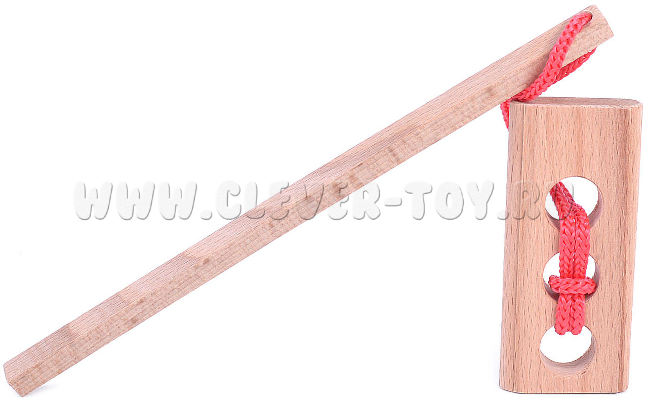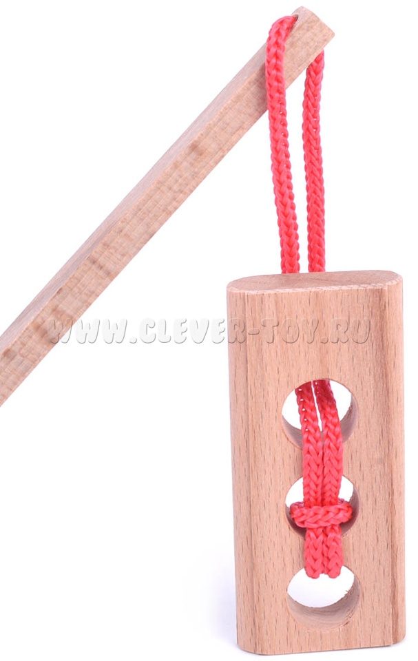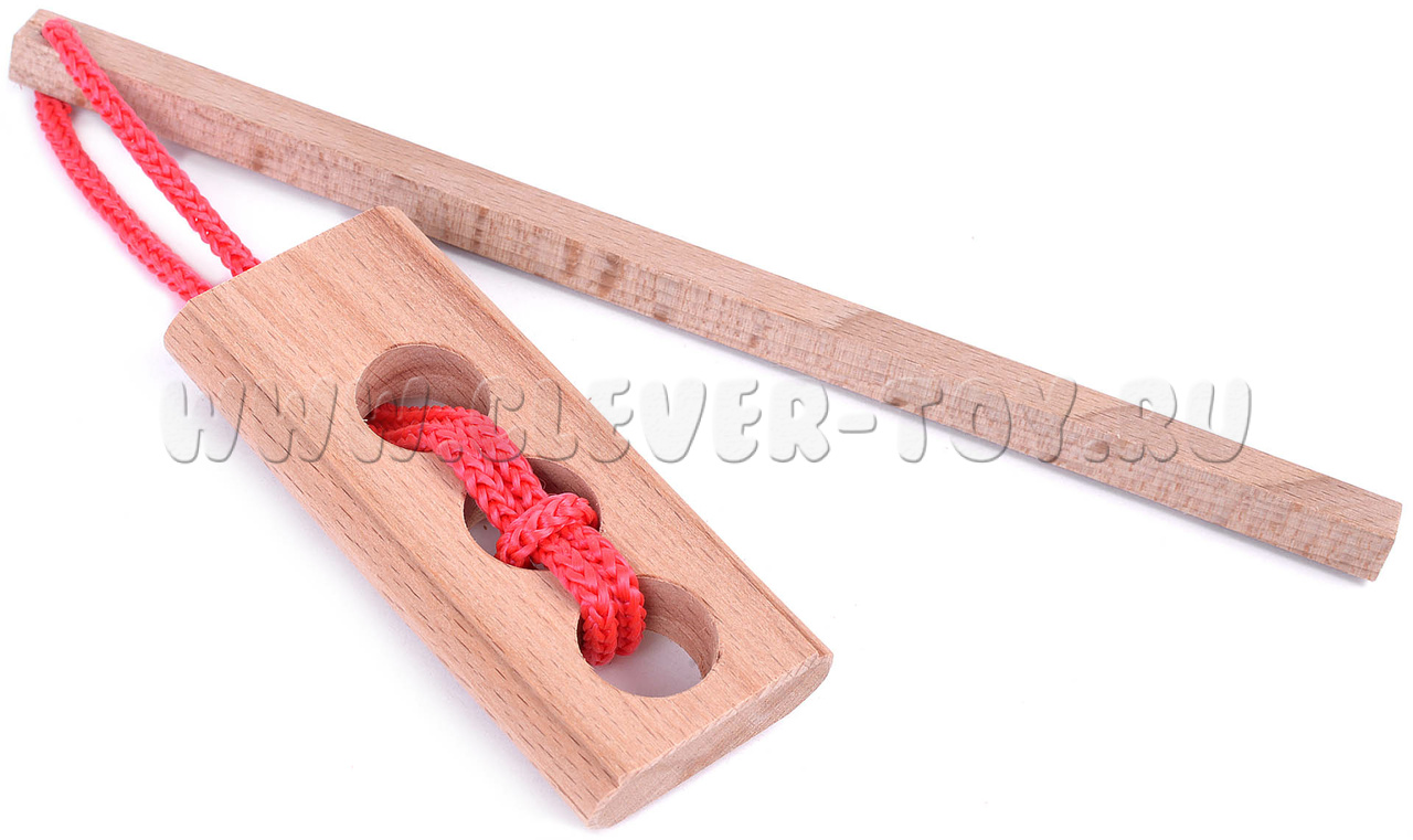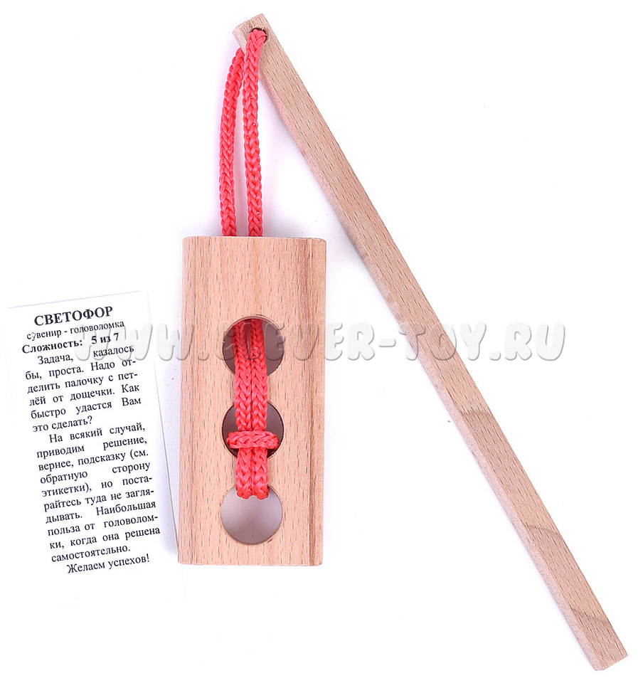 Головоломка "Светофор" выполнена в виде деревянной дощечки с тремя отверстиями и палочки с веревкой на конце. Задача игрока - отделить палочку с петлей от дощечки. Казалось бы, решение простое, однако уровень сложности головоломки говорит об обратном (5 из 7).
