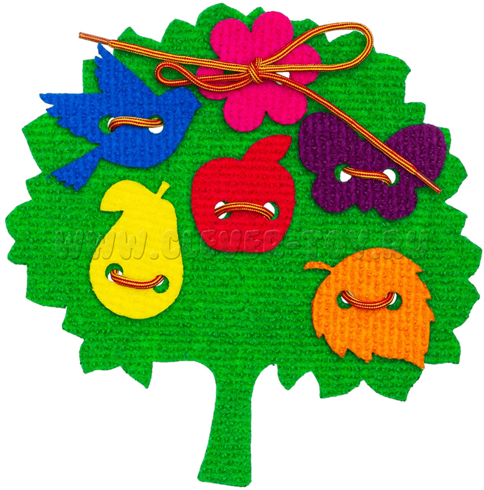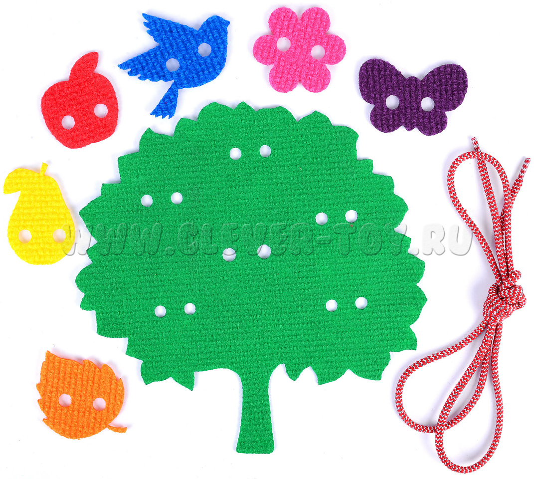 Например, «Украшаем деревце» - игра для самых маленьких. Вместе с ребёнком наложите одну фигуру на другую и соедините с помощью шнурка. Игра «Кто быстрее?» - предложите малышу посоревноваться в том, кто быстрее с помощью шнурка прикрепит все игровые элементы.