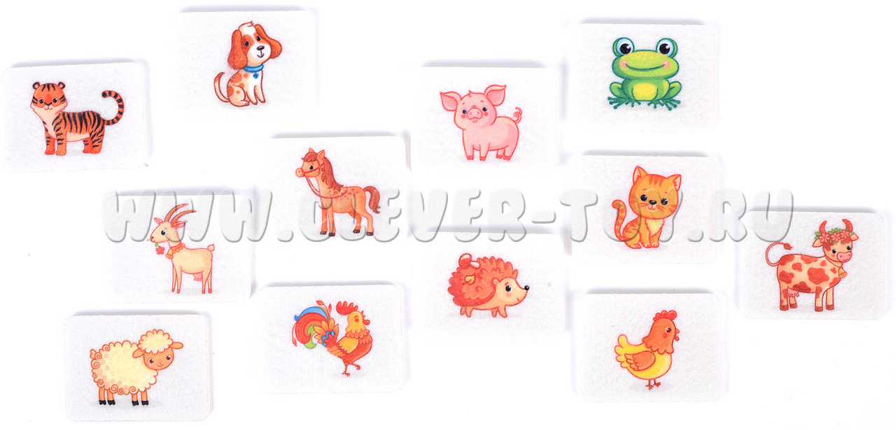 • Прямоугольники с животными: котенка, собачки, петушка, курочки, козочки, лошадки, поросенка, овечки, коровки, лягушки, тигра и ежика (12 шт.).