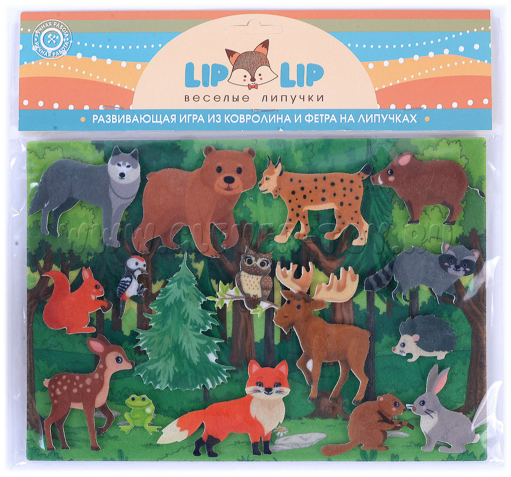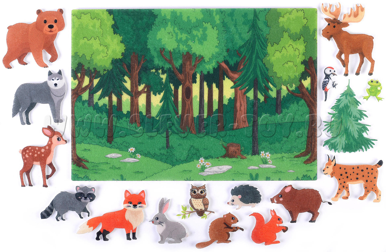• 18 фигурок лесных животных, в том числе: мишка, белка, волк, заяц, лиса, бобёр, кабан, енот, лось и др.;