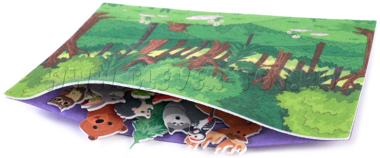 • тематическое игровое поле, стилизованное под лесную полянку, в виде конверта, в котором удобно хранить игровые элементы;