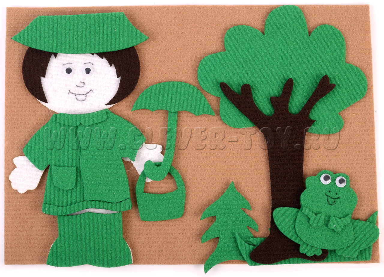 • одежда, аксессуары и атрибуты весны (зелёный): шапка, пальто, сапоги, корзинка, зонт, дерево, трава, лягушонок, цветок;