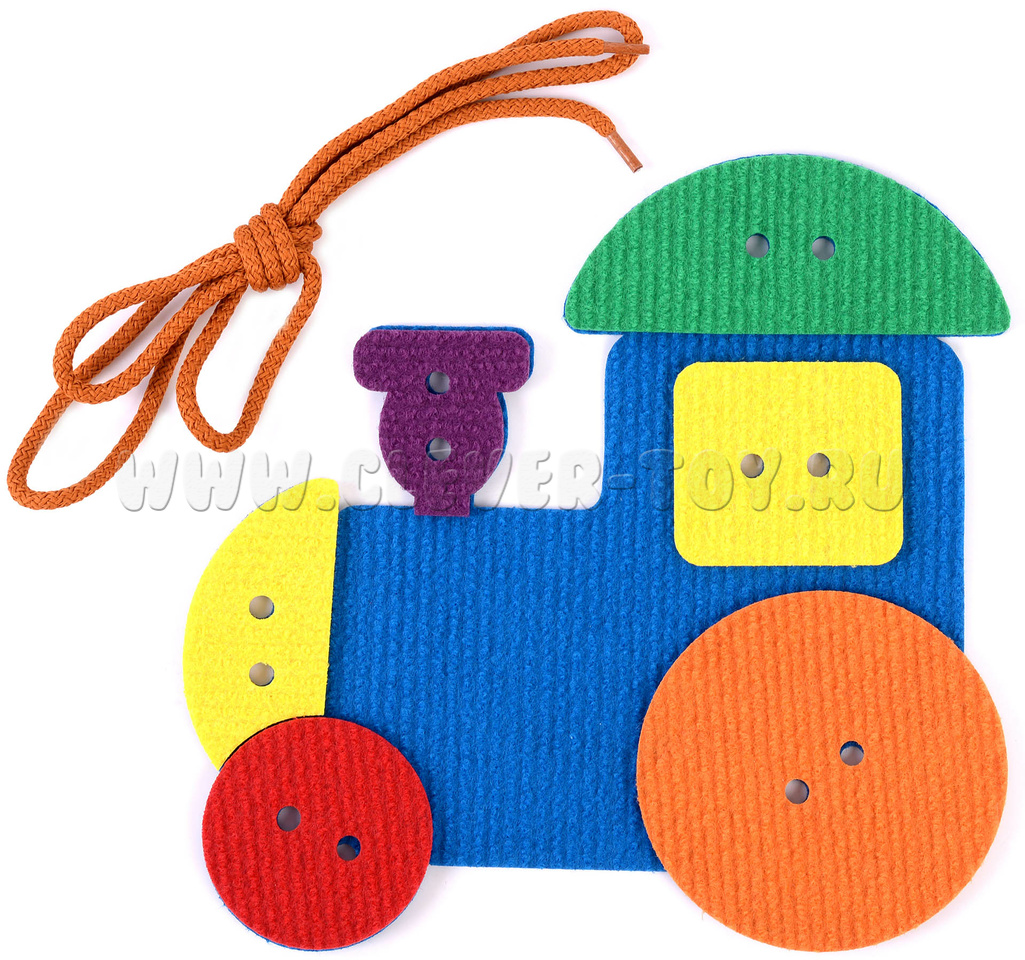 Например, игра «Как устроен паровоз» - для самых маленьких. Вместе с малышом изучите детали паровоза и сложите их на столе. Затем начните по очереди соединять элементы – накладывать друг на друга, а затем пропускать шнурок/нанизывать шнурок на элемент, после чего прикреплять его к основной фигуре. Для старших дошкольников – игры «Геометрические фигуры», «Найди ошибку».