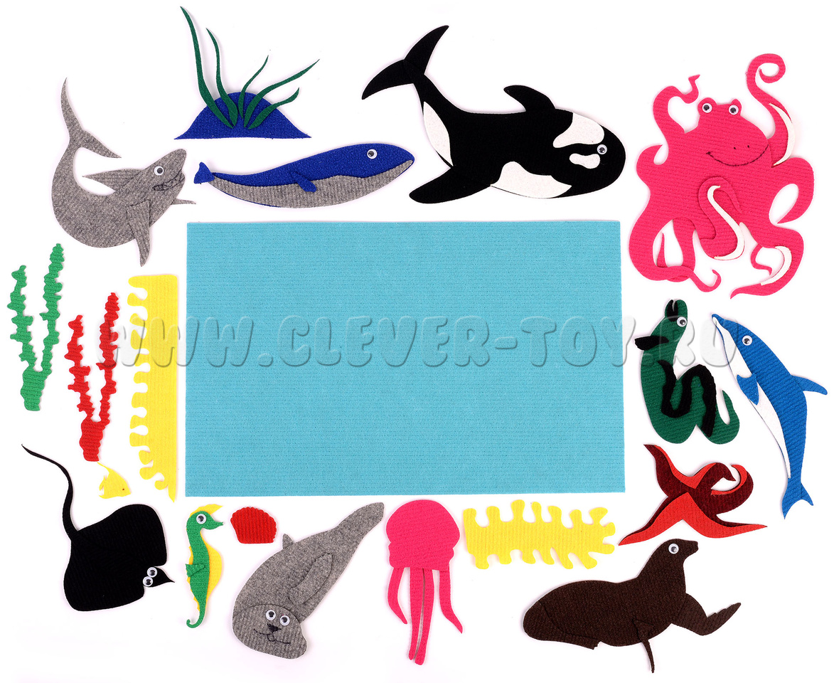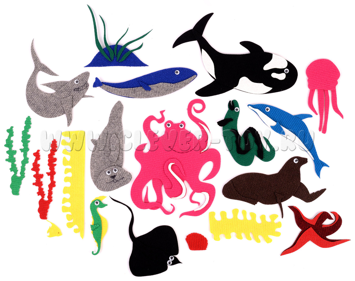 - обитатели моря: осьминог, касатка, морской котик, тюлень, кит, акула, скат, медуза, морской конёк, дельфин, мурена, морская звезда, рыбка;