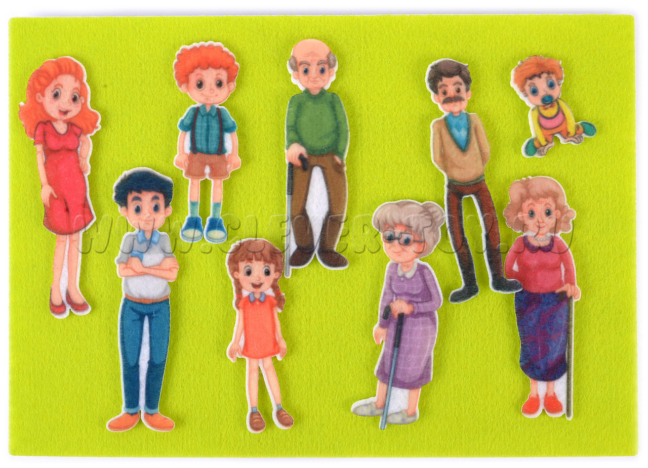 • 9 фигурок в полный рост: два дедушки, две бабушки, мама с папой и трое детей (старший мальчик, старшая девочка и малыш);