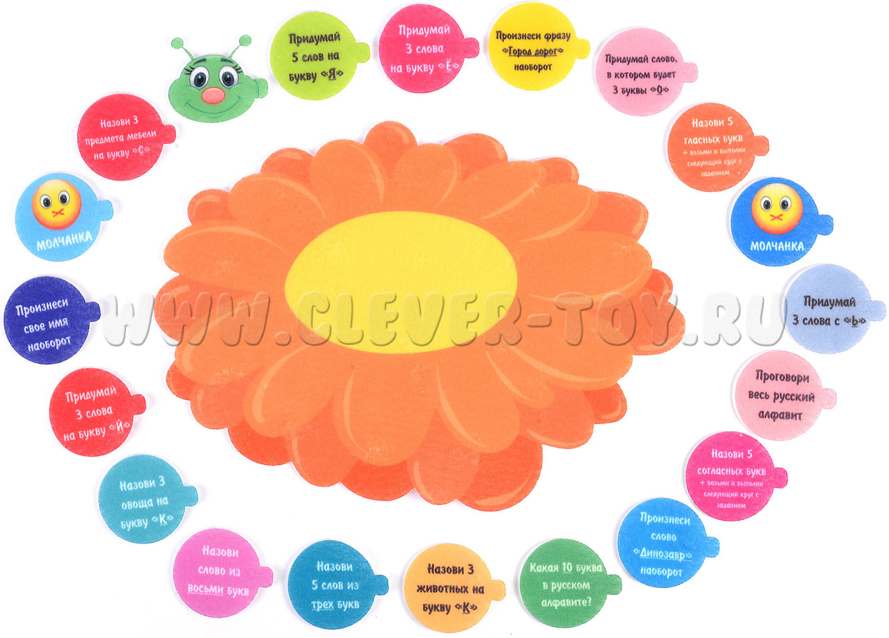 В комплекте: цветок размером 27 * 20 см, кружки с заданиями диаметром 4,5 см, голова гусенички размером 3,5 * 4,5 см и фигурки на липучках.