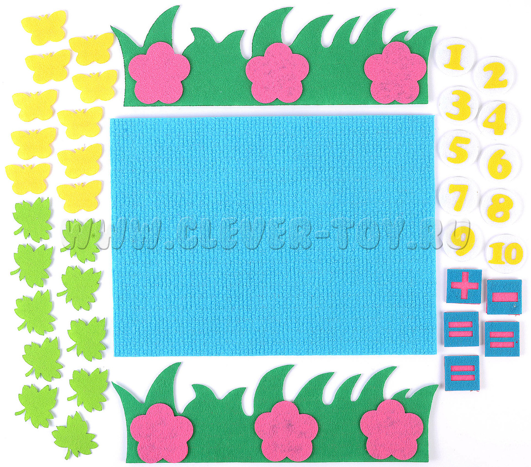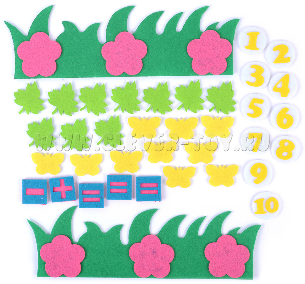 • Набор из 36 фигурок (бабочки, листики, цифры, знаки, трава),