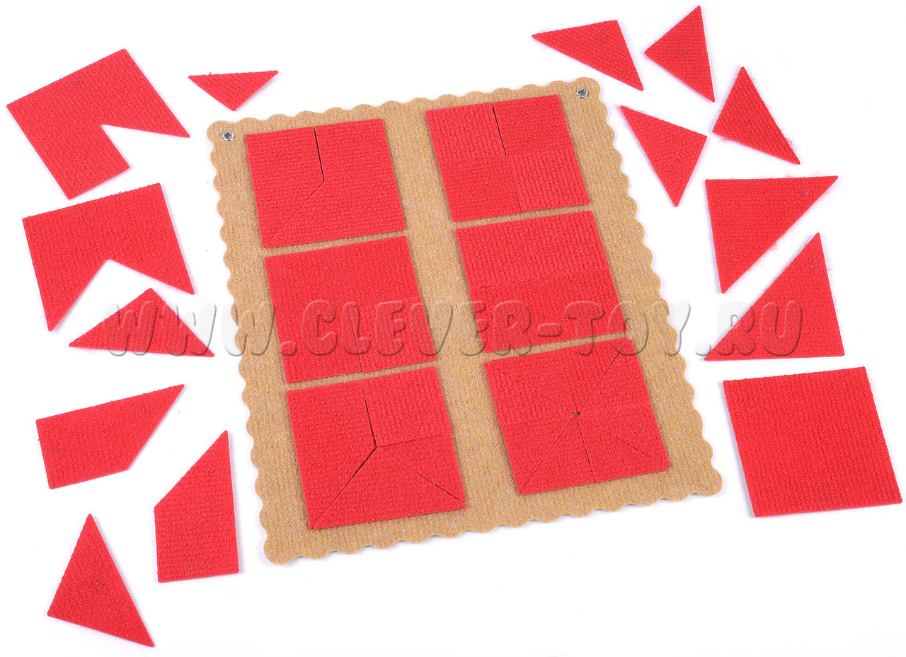 • 36 элементов из ковролина (многоугольник 1 – 1 шт., многоугольник 2 – 1 шт., многоугольник 3 – 1 шт., многоугольник 4 – 1 шт., треугольник маленький – 10 шт., треугольник средний – 7 шт., треугольник большой – 2 шт., квадрат большой – 1 шт., прямоугольник – 2 шт., трапеция 1 - 3 шт., трапеция 2 – 1 шт., квадрат маленький – 6 шт.;