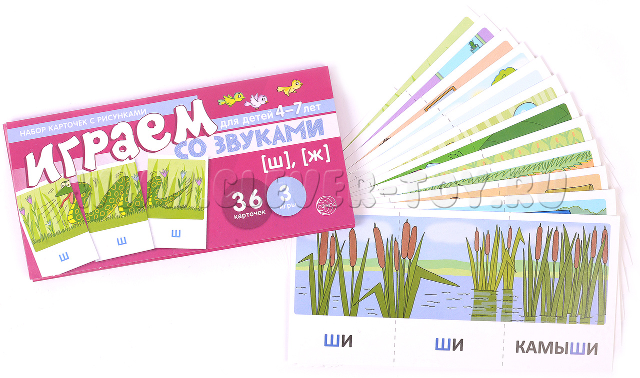 В комплекте 12 обучающих карточек, разделённых на 36 карточек и 3 игры. Ребёнок в игровой форме познакомится с шипящими звуками [ш] и [ж], научится их правильно произносить, сделает гимнастику для языка и выполнит артикуляционные упражнения.
