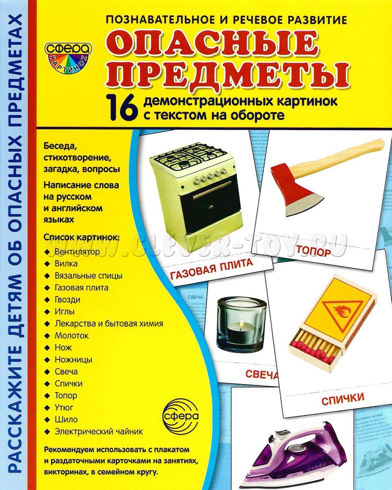 Комплект "Опасные предметы" из серии "Сфера картинок" состоит из 16 цветных демонстрационных карточек. Он предназначен для детей и их родителей, которые хотят узнать больше о бытовых приборах и предметах, требующих осторожного обращения.