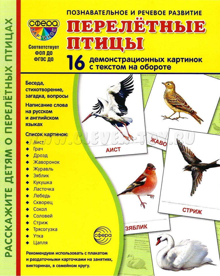 Набор карточек "Перелётные птицы" состоит из 16 цветных демонстративных карточек (картинок) и адресован детям, желающим познакомиться с птицами, которые.