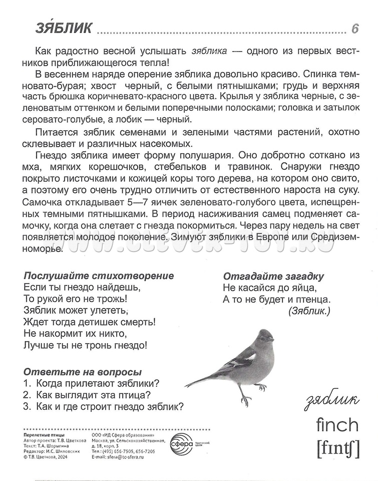 На обратной стороне каждой дидактической карточки представлены описания характерных черт птиц. Детям предлагают послушать стихотворение и разгадать загадку. Например, изучая изображение жаворонка, вы можете рассказать о том, что его радостные песни можно услышать в северных регионах, в Крыму и на Кавказе. Чтобы развить внимательность и закрепить материал, детям задают вопросы: "Как выглядит жаворонок?", "Где жаворонок вьёт гнездо?"