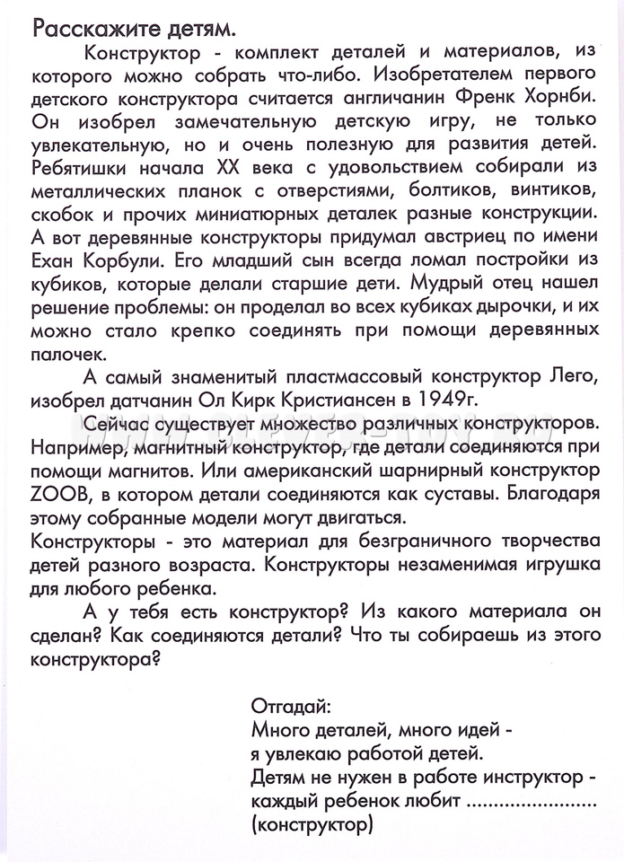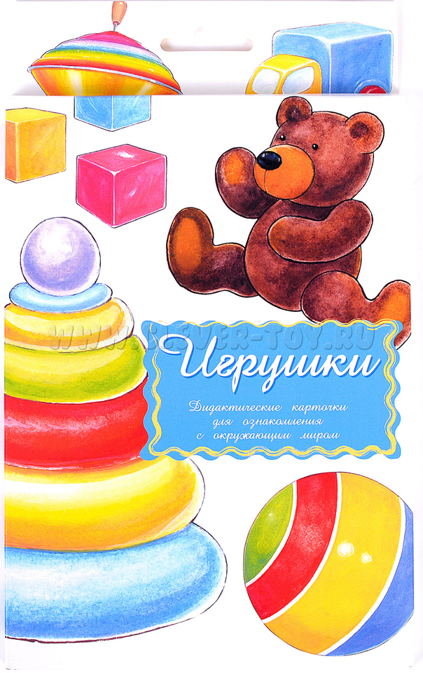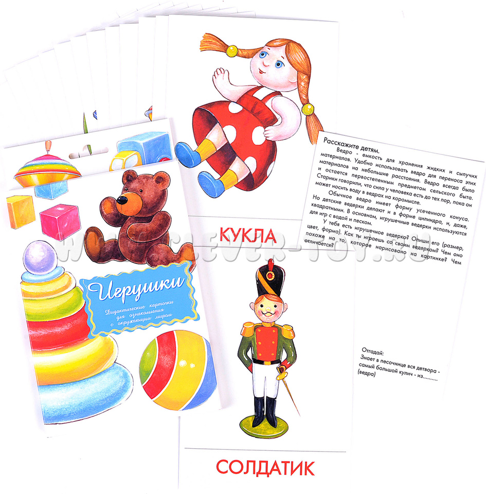 На одной стороне карточки расположена яркая картинка с изображением игрушки, на обратной стороне – доступная для ребёнка информация об игрушках (описывает внешний вид игрушки, её историю, принцип действия). Также на обратной стороне карточки родители и педагоги найдут вопросы, которые нужно задать ребёнку и короткие интересные загадки.