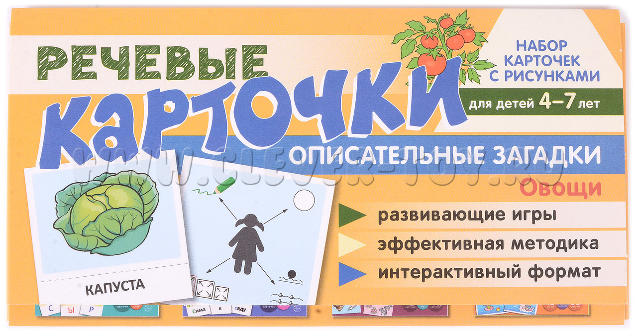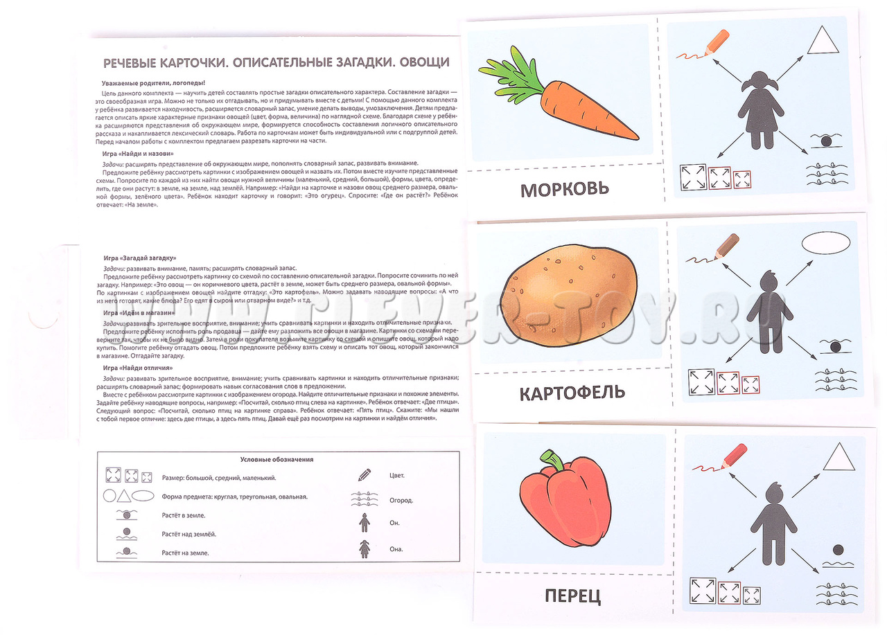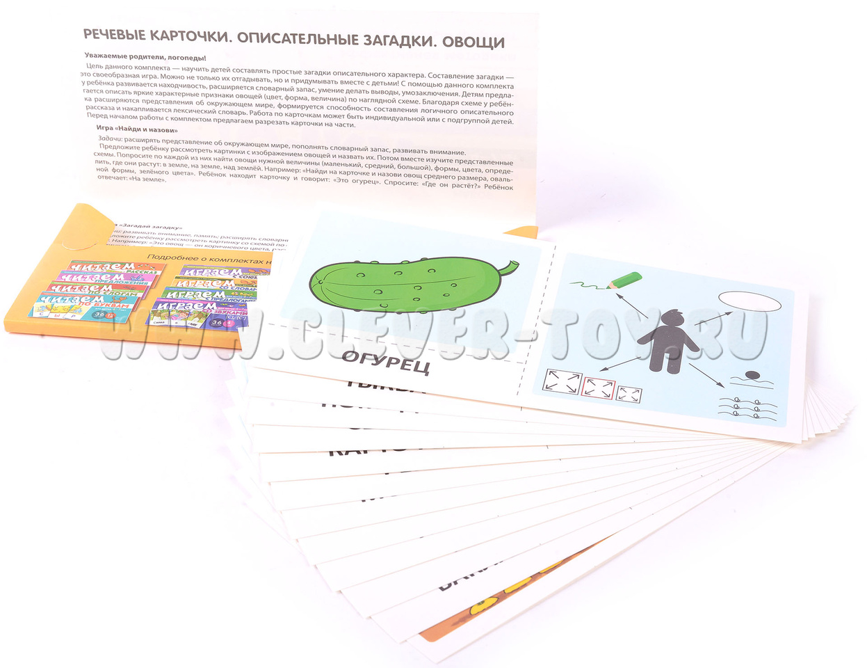 Набор "Речевые карточки. Описательные загадки. Овощи" включает в себя 12 листов с 35 карточками и 4 игры.