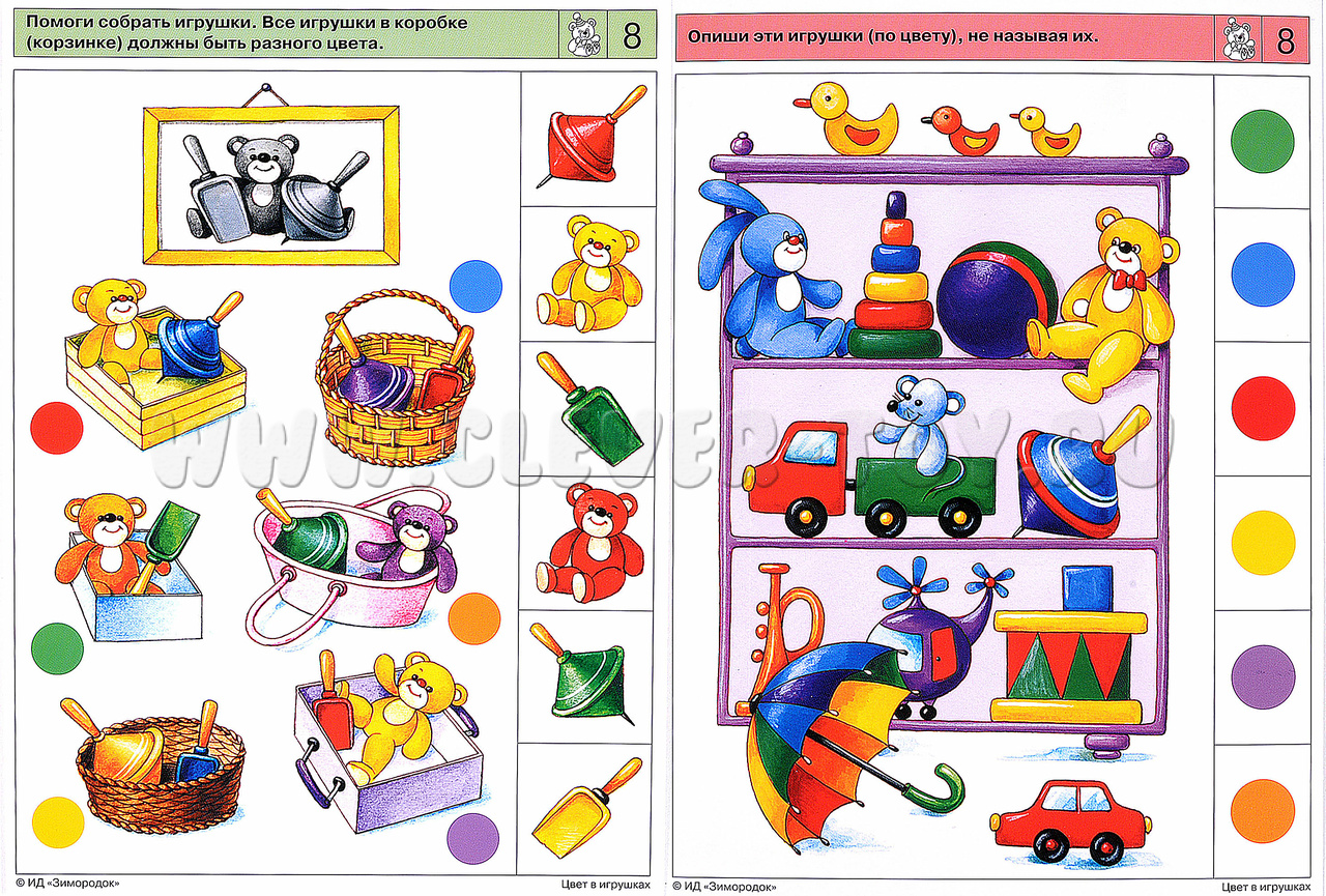 Первое знакомство ребёнка с цветом. Задания комплекта научат малыша узнавать, различать и называть цвета, выбирать целое изображение заданного цвета или его части (цвет мишки и отдельно цвет шапочки на нем), сравнивать изображения по цвету между собой и группировать их по этому важнейшему признаку. Примеры заданий в карточках: 1а. Покажи такую же игрушку, только маленькую. Назови цвет каждой игрушки. 2а. «Завяжи» куклам бантики. Подбери подходящие по цвету ленточки. 3б. Из ниток какого цвета сделан узор на одежде каждого медвежонка 4б. «Поставь» каждую машинку в гараж. 8а. Помоги собрать игрушки. Все игрушки в коробке должны быть разного цвета.