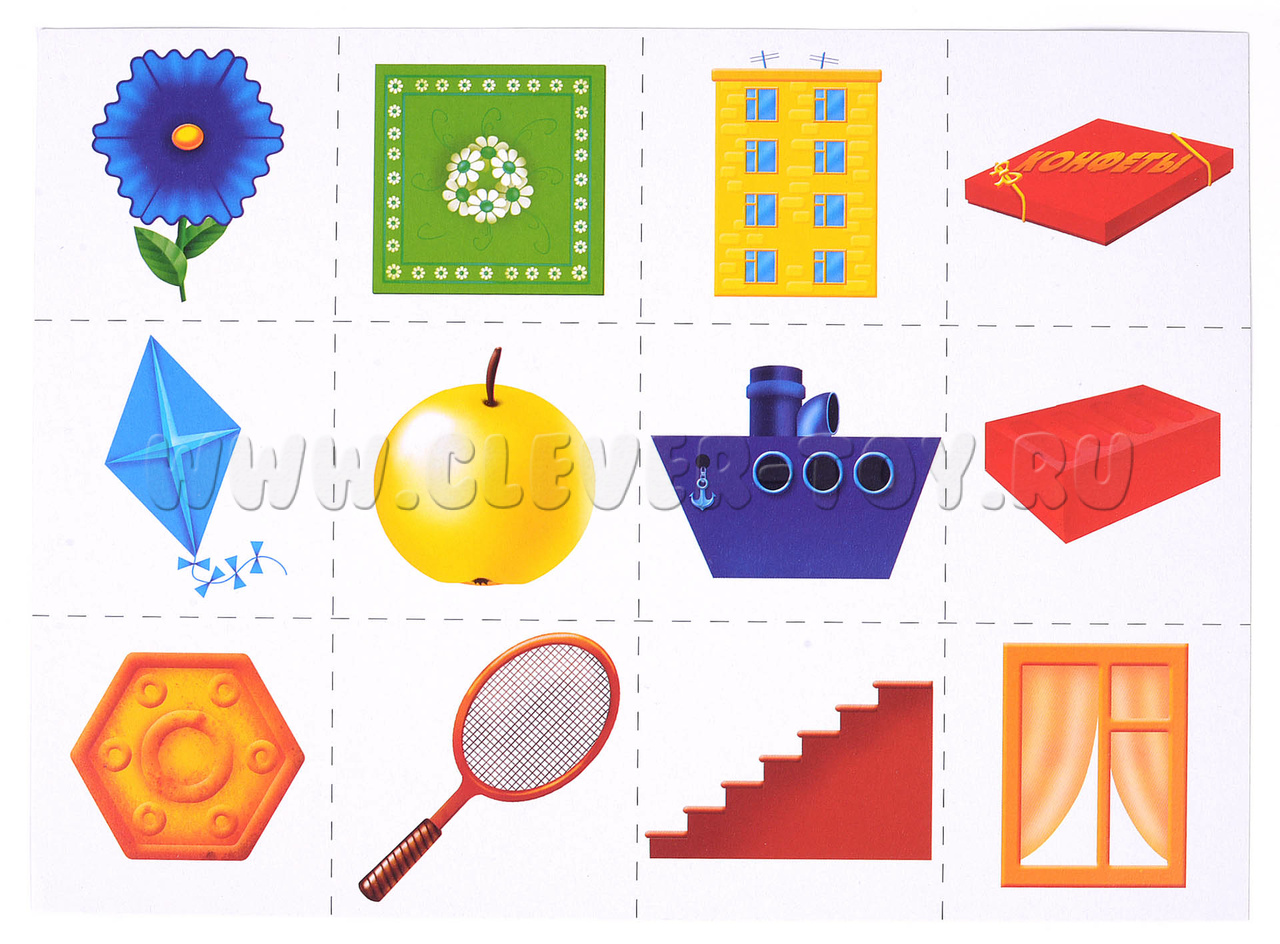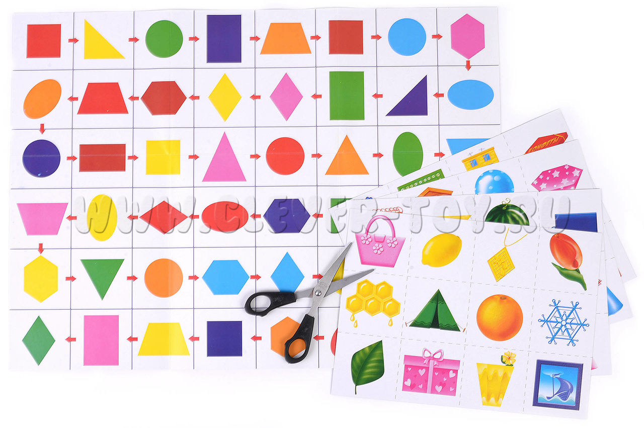 Игра включает в себя большое игровое поле и 4 разрезных карты с предметами разных форм и цветов. Перед началом игры разрежьте карты по пунктирным линиям. Получится 48 карточек с картинками. Карточки перемешайте и раздайте участникам поровну. Игроки должны выложить свои карты стопкой картинками вниз. Случайным образом выбирается тот, кто начинает игру. Начинающий берет верхнюю карточку из своей стопки и проверяет, подходит ли предмет на его карточке по цвету или форме к первой клетке игрового поля. Если да – карточка выкладывается на клетку поля, если нет – карточку откладывают в сторону. Следующий участник поступает аналогичным образом со следующей клеткой поля. Участник имеет право на ход вне очереди, если фигура на его карточке подходит к фигуре на поле и по цвету, и по форме. Если у игрока в стопке закончились карточки, он может использовать те, что были отложены в сторону. Если подходящей карточки нет, участник пропускает ход. Побеждает тот, кто первым выложит все свои карточки на игровое поле.