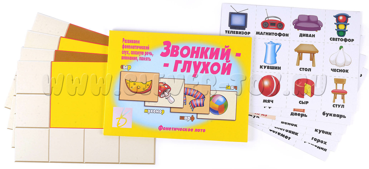 • На карты с желтым прямоугольником выкладываются картинки-слова со звонким согласным звуком, на карты с коричневым прямоугольником - с глухим.