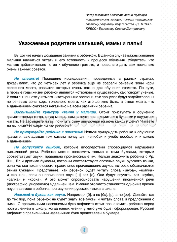 Расположение букв в букваре соответствует порядку появления звуков в речи ребёнка, что позволяет начать обучение чтению уже в четыре года, когда дети ещё не произносят сложные звуки русского языка. Этот букварь помогает легко развить у ребёнка навыки осознанного чтения и предотвратить проблемы с письменной речью (дисграфию и дислексию) в будущем.