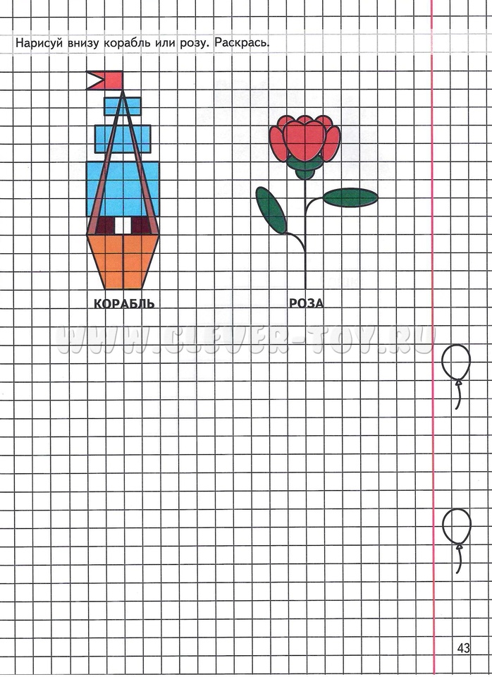 Для формирования навыка самоконтроля и самооценки рядом с каждым заданием на полях тетради нарисованы шарики: ребенок должен раскрасить их зеленым карандашом, если выполненный рисунок похож на образец (схематическое изображение); красным, если при рисовании были допущены ошибки.