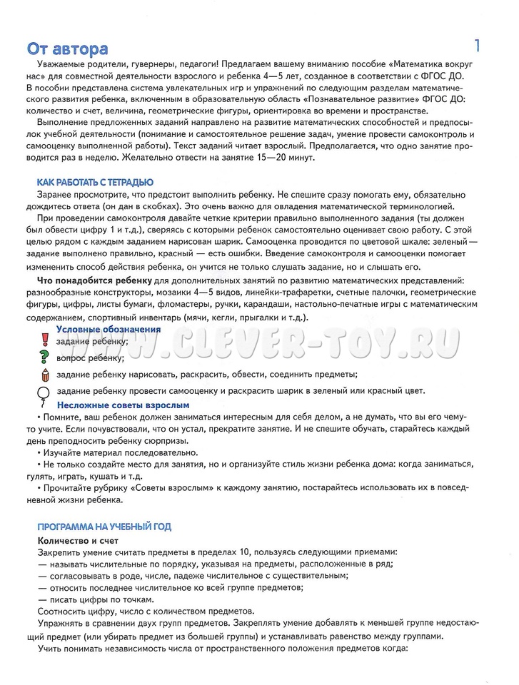 Также в тетради есть Условные обозначения, описанные на титульном листе и планируемы результаты в конце тетради, для оценки проделанной работы. Чтобы заинтересовать ребёнка выполнением заданий в рабочей тетради, она содержит персонажей: Аню, Ваню, Мишку (с заданиями по геометрии), Лисичку (задания о временах года и частях суток), Зайку (величина предметов) и Белочку (ориентация в пространстве).