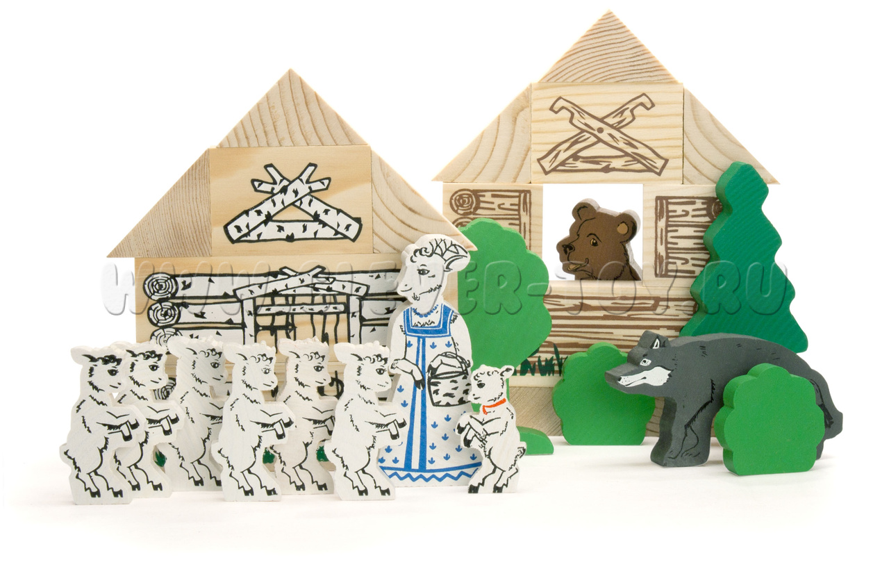 В набор входят деревянные модели персонажей и декорации сказки "Волк и семеро козлят" (всего 28 деталей), а также вкладыш с текстом сказки.