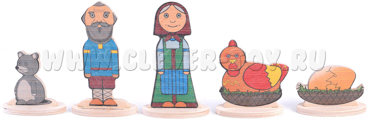 • 5 сказочных персонажей на подставках(Дед, Бабка, Курочка, Мышка, Яйцо) от 5 до11,5 см.;