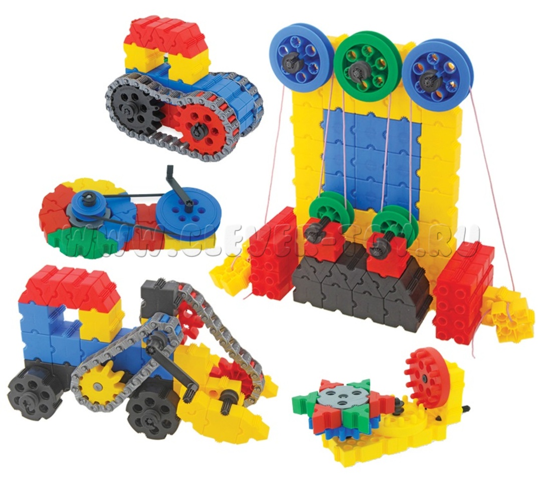 В состав комплекта включены шестерени 5-и разных размеров, цевочные колеса, наборы для сборки реечной, цепной и ременной передачи, разноцветные детали 10 разных конфигураций, валы, фиксаторы, соединительные элементы разной формы, рукояти для вращения.