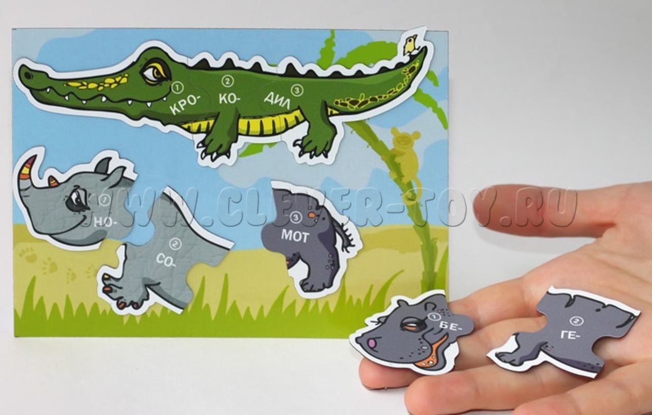 На поле нарисована жаркая Африка, в которой живут бегемот, крокодил, носорог. В нашем варианте каждый из них состоит из трех частей. Малыши должны правильно собрать этот забавный конструктор так, чтобы бегемот не был похож, допустим, на крокодила, а у носорога остался собственный, а не чужой хвост.
