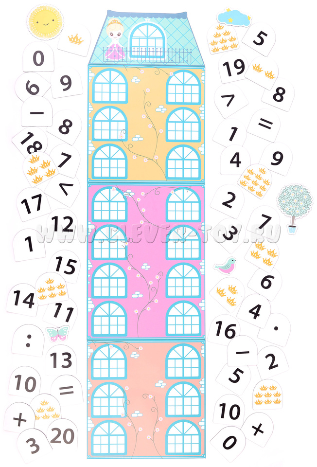 Вместо скучных примеров - захватывающая миссия. Соберите 4 магнитных поля в высокий замок (86 см) и вооружитесь 57 карточками (6×6 см). Чтобы открыть магическую дверь и вызволить принцессу, нужно верно подобрать цифры и знаки действий.