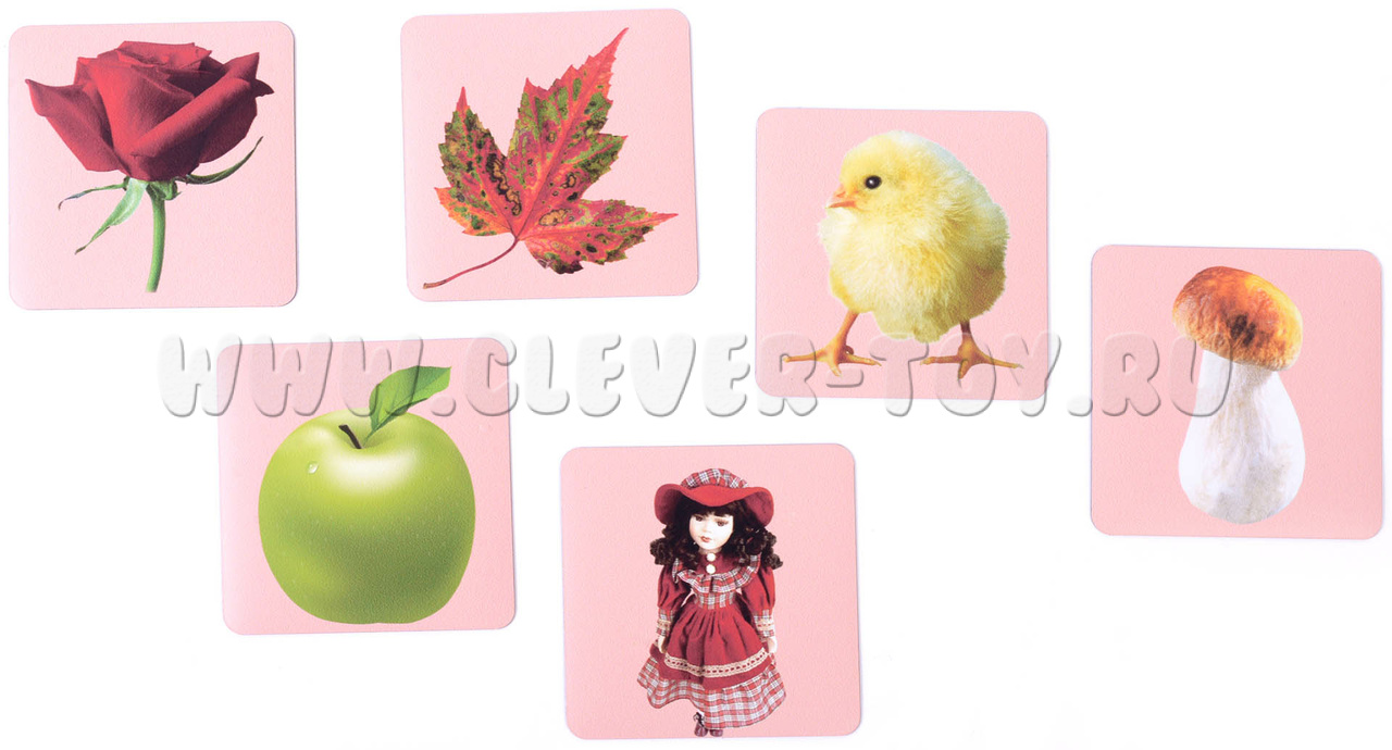Набор состоит из 30 карточек размером 7х7 см. На розовом фоне изображены 6 картинок: роза, яблоко, лист, цыплёнок, кукла и гриб.