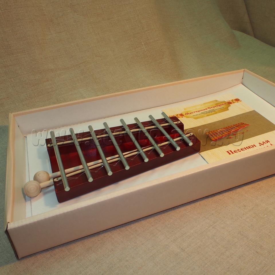 Металлофон изготовлен из 8 стальных прутков диаметром 6 мм, которые крепятся к резонатору. После закалки и гальванической обработки металл имеет мягкий, певучий и благозвучный голос.