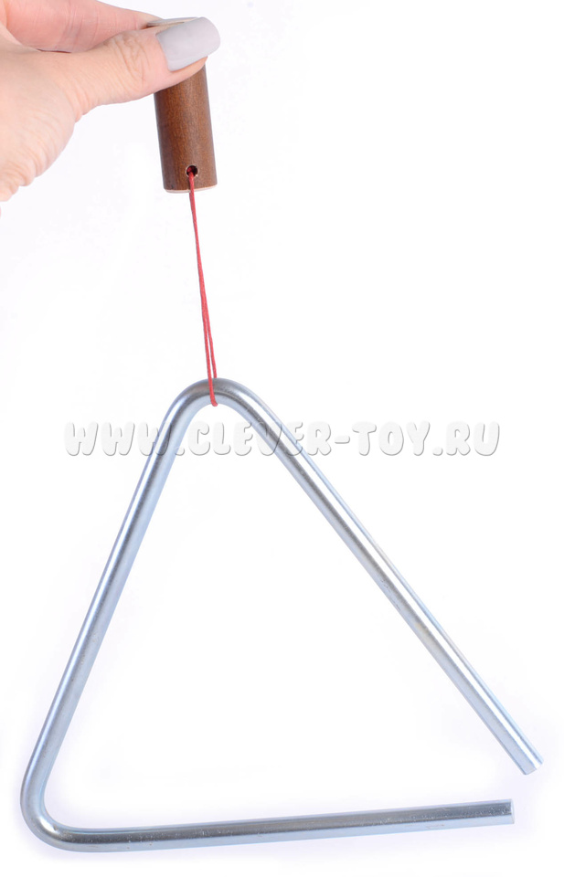 Треугольник выполнен из стали диаметром 8мм, длина стороны - 16см. Гальваническое покрытие не ухудшает качество звука и не разрушается при механическом воздействии. Ударная палочка из нержавеющей стали.