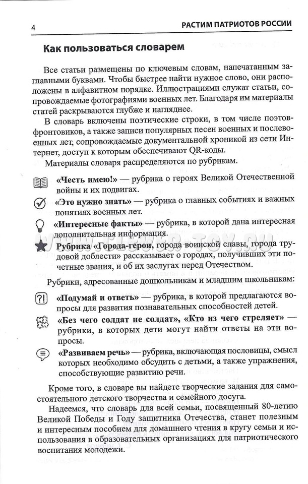 Словарь полезен тем, кто хочет уточнить и пополнить знания об исторических событиях периода Великой Отечественной войны, а также тем, чьи профессиональные интересы связаны с решением задач гражданско-патриотического воспитания подрастающего поколения.