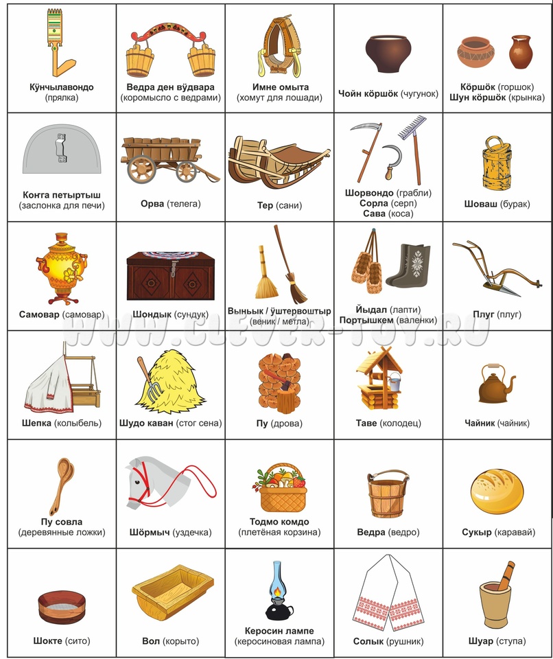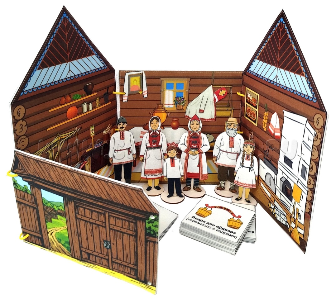 Вместе с папкой вы получите 6 фигурок людей (семья в национальных костюмах) и 30 карточек, изображающих предметы быта. Данный набор может использоваться как демонстрационный материал на занятиях по народной культуре.