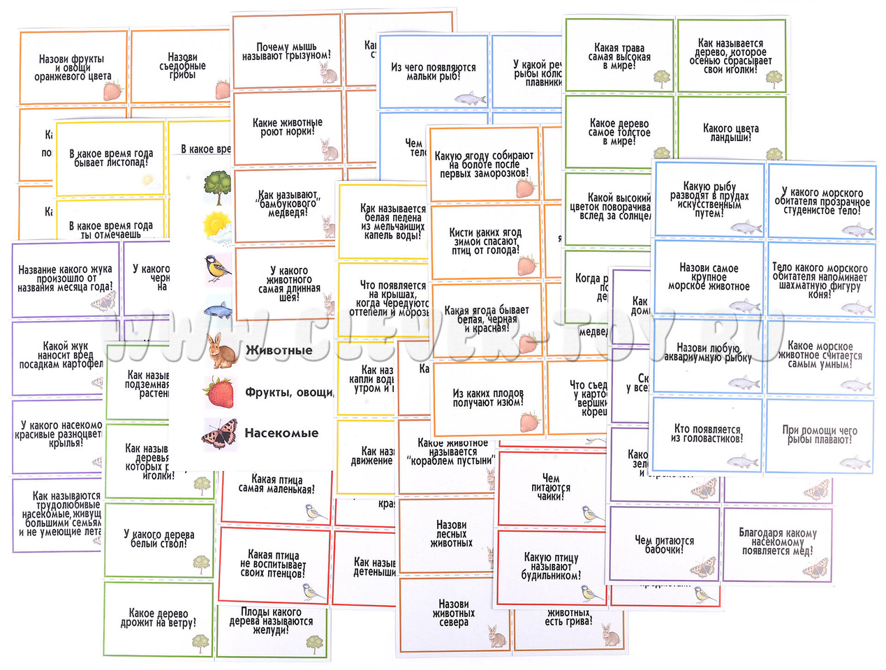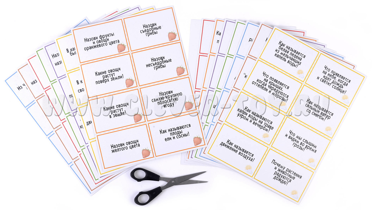 Правила игры: Перед началом игры разрежьте карты по пунктирным линиям, у вас получится 112 карточек с заданиями, по 16 на каждую из 7 тем.