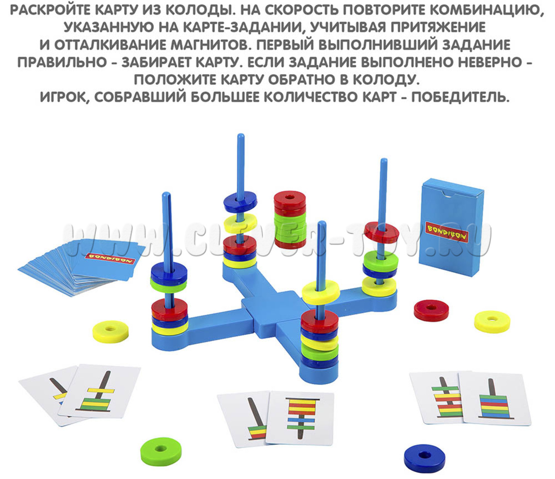 Откройте карту-задание из колоды. На скорость повторите комбинацию, указанную на ней, учитывая притяжение и отталкивание магнитов. Кто первым выполнит задание - забирает карту. 5 заработанных карт - победа!