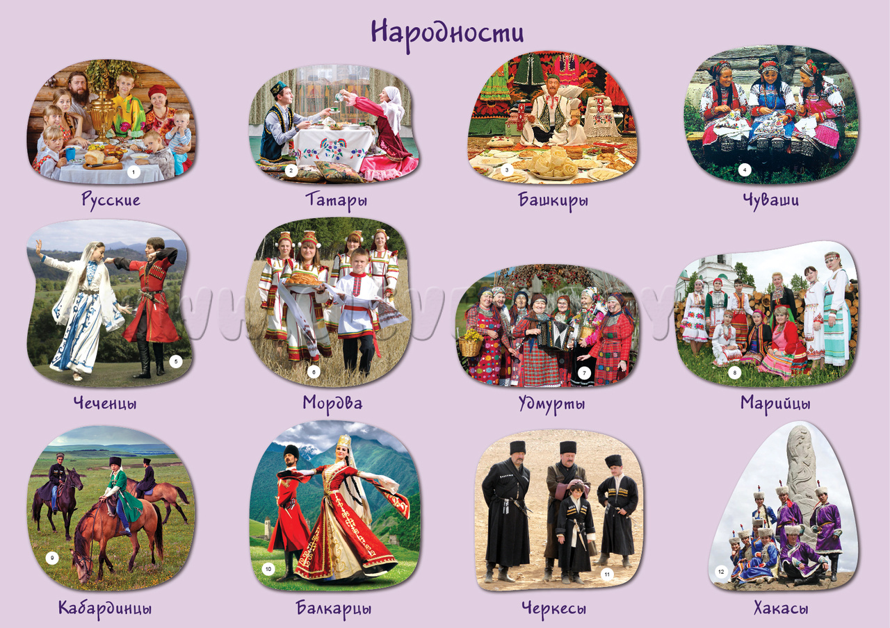 В наборе 23 магнитных карточки, которые рассказывают, о разных народах, проживающих в нашей стране.