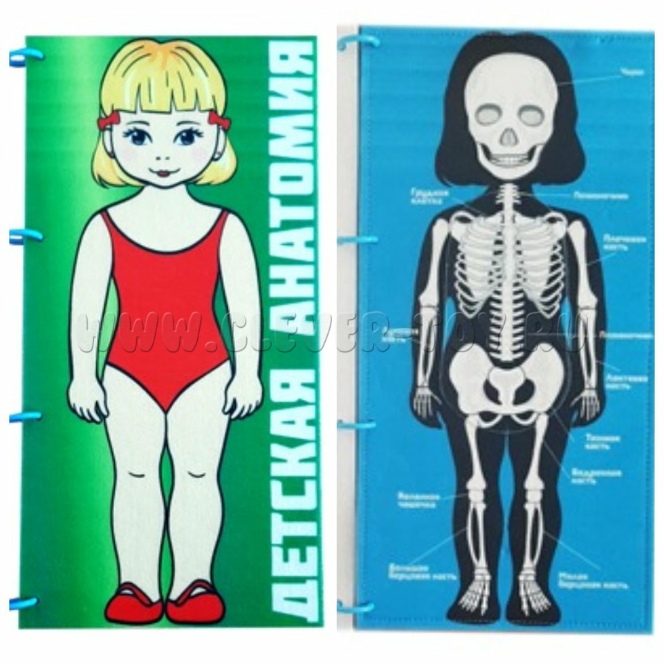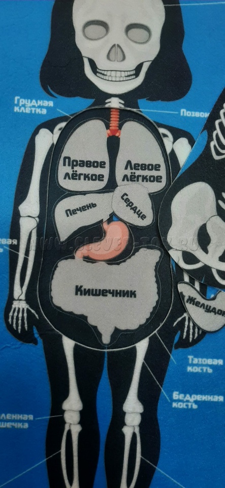 На папке-игрушке изображён детский скелет с внутренними органами, их названиями и расположением. Органы можно собирать и разбирать как пазл. Игрушка сделана из фетра, её размер - 40*20 см.