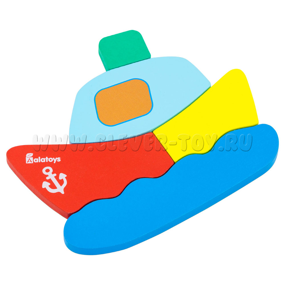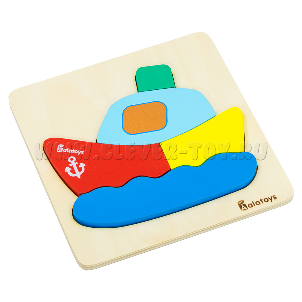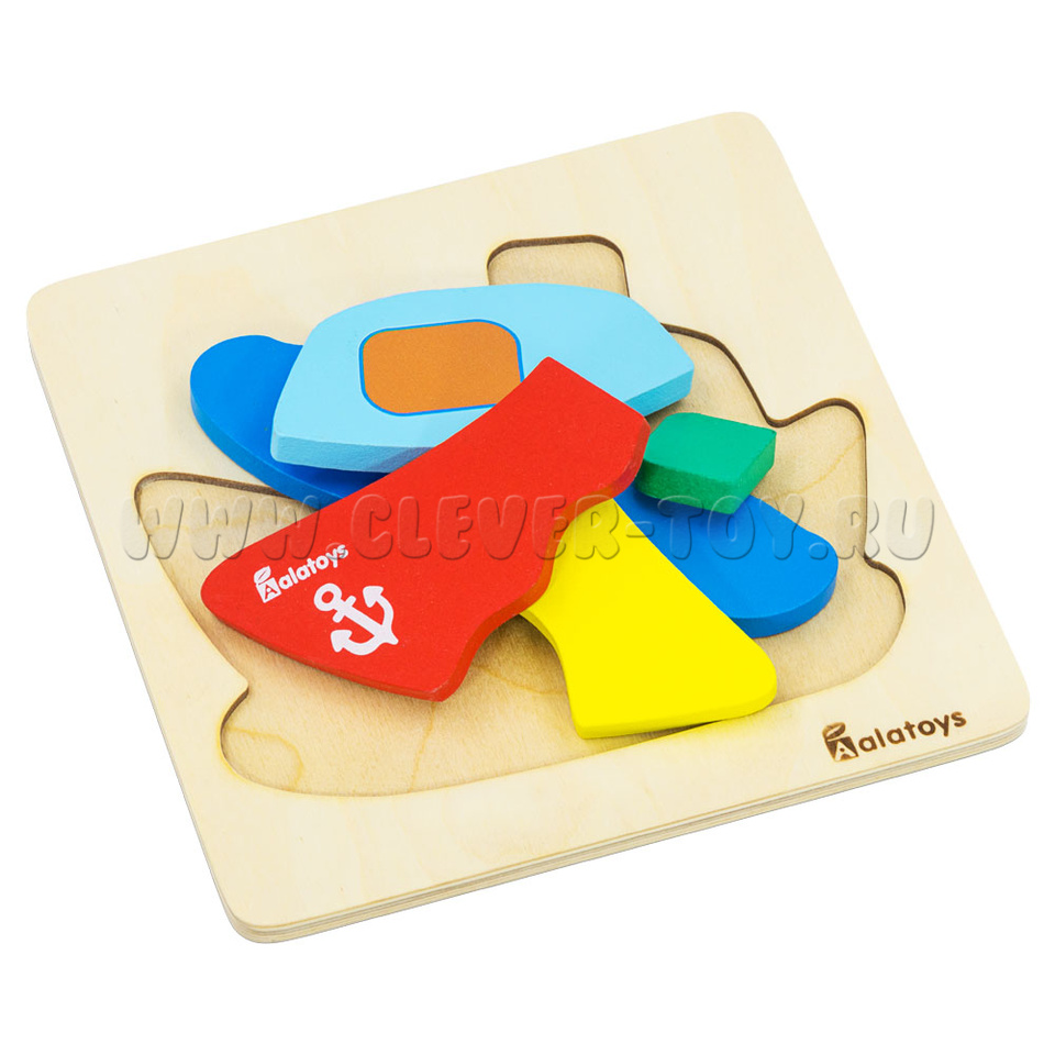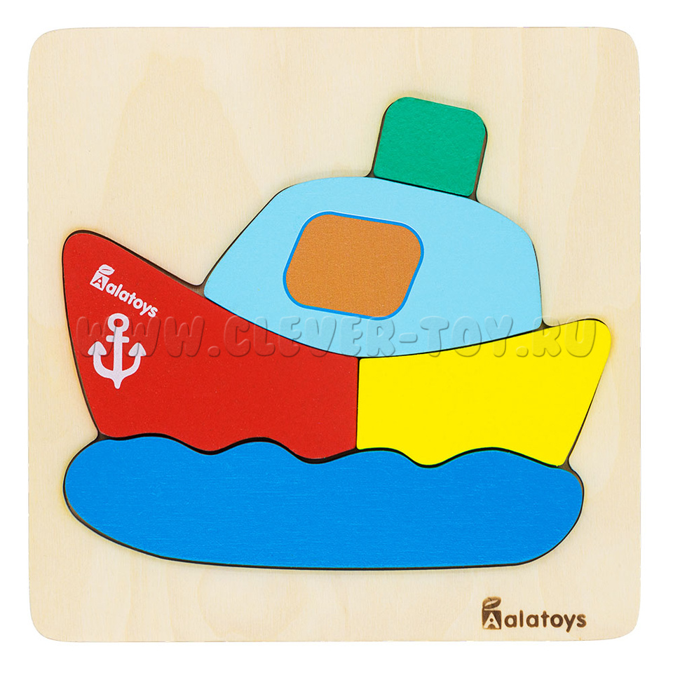 Развивающая игрушка пазл «Кораблик» представляет собой деревянную основу с углублениями для размещения деталей кораблика. Только правильно подобрав детали по форме и размеру, у ребёнка получится сложить правильные пазлы.