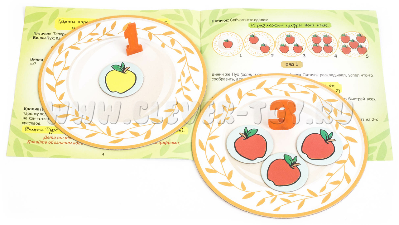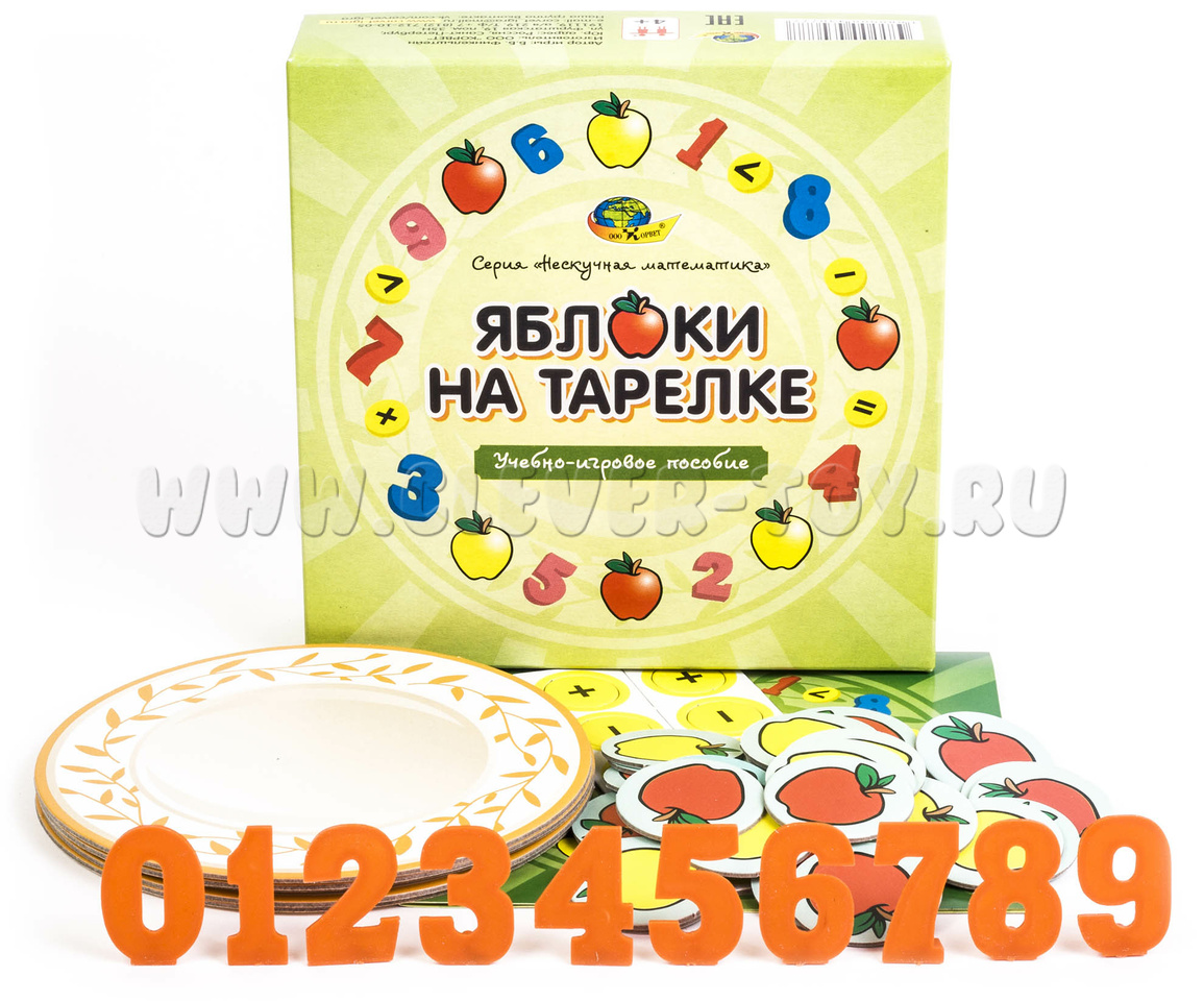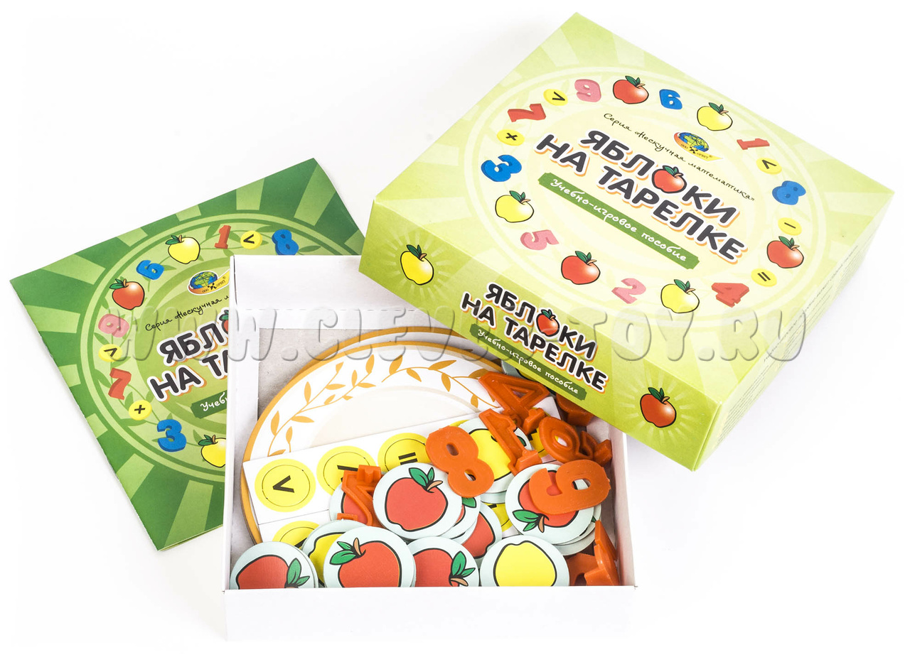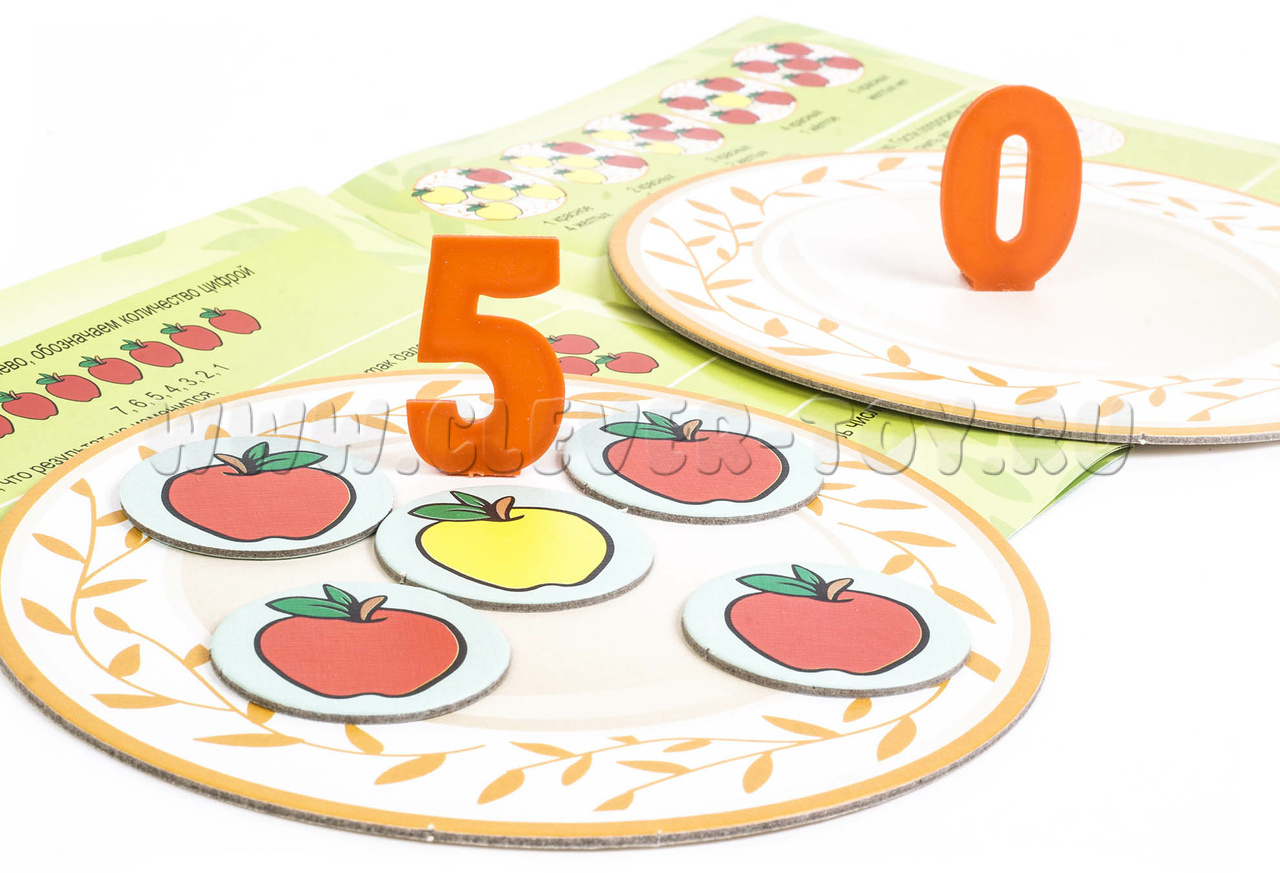 Размеры игровых элементов: тарелки – 14 см., яблоки – 3,5 см., цифры – 4,5 см., знаки – 2 см.
