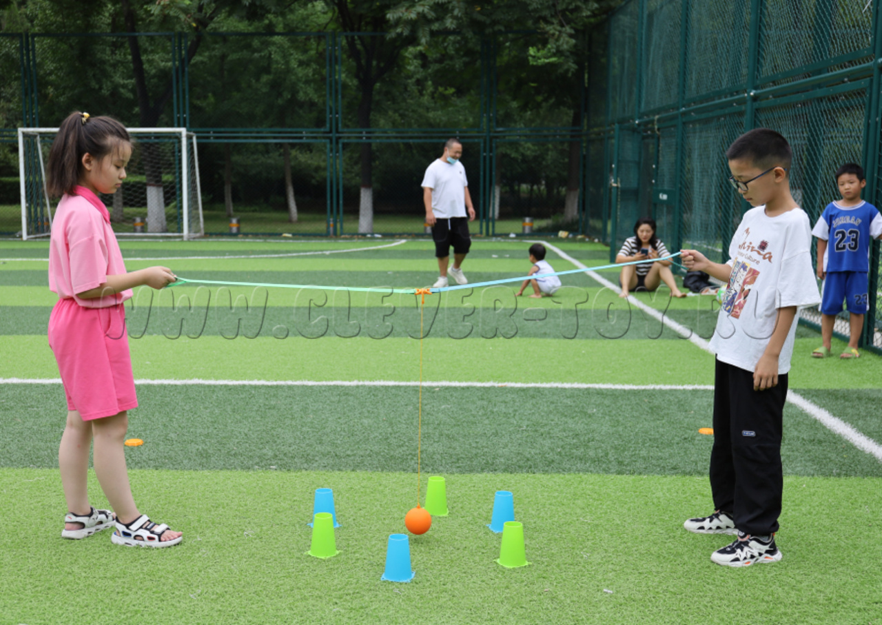 Игровой набор "Эстафета" состоит из кеглей и мячика, подвешенного на ремнях. Играют парами.