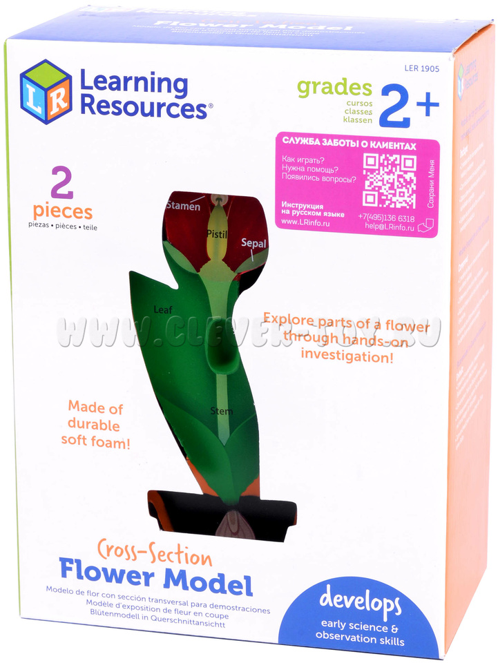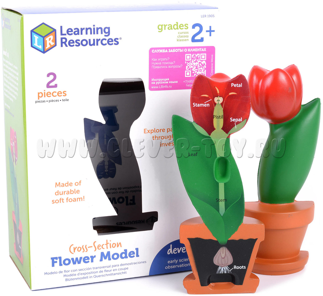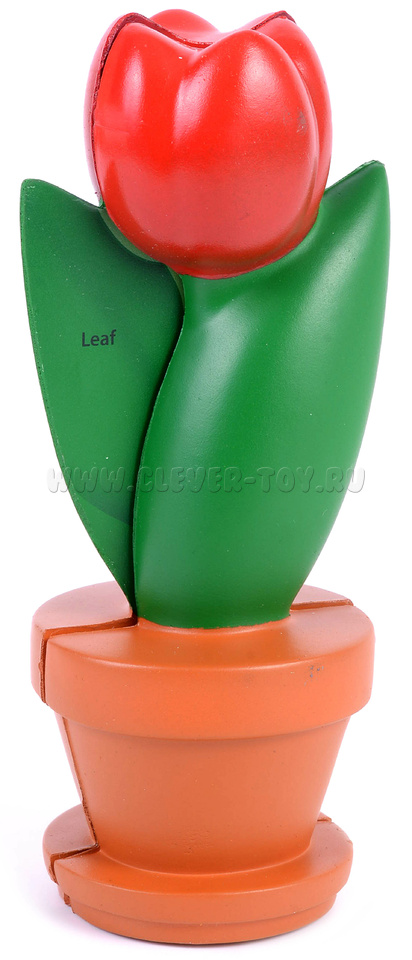 Реалистично подробная пластиковая модель цветка разделяется на половинки: на одной - названия частей цветка (на английском языке), на другой - только буквенное обозначение, для самостоятельной проверки.