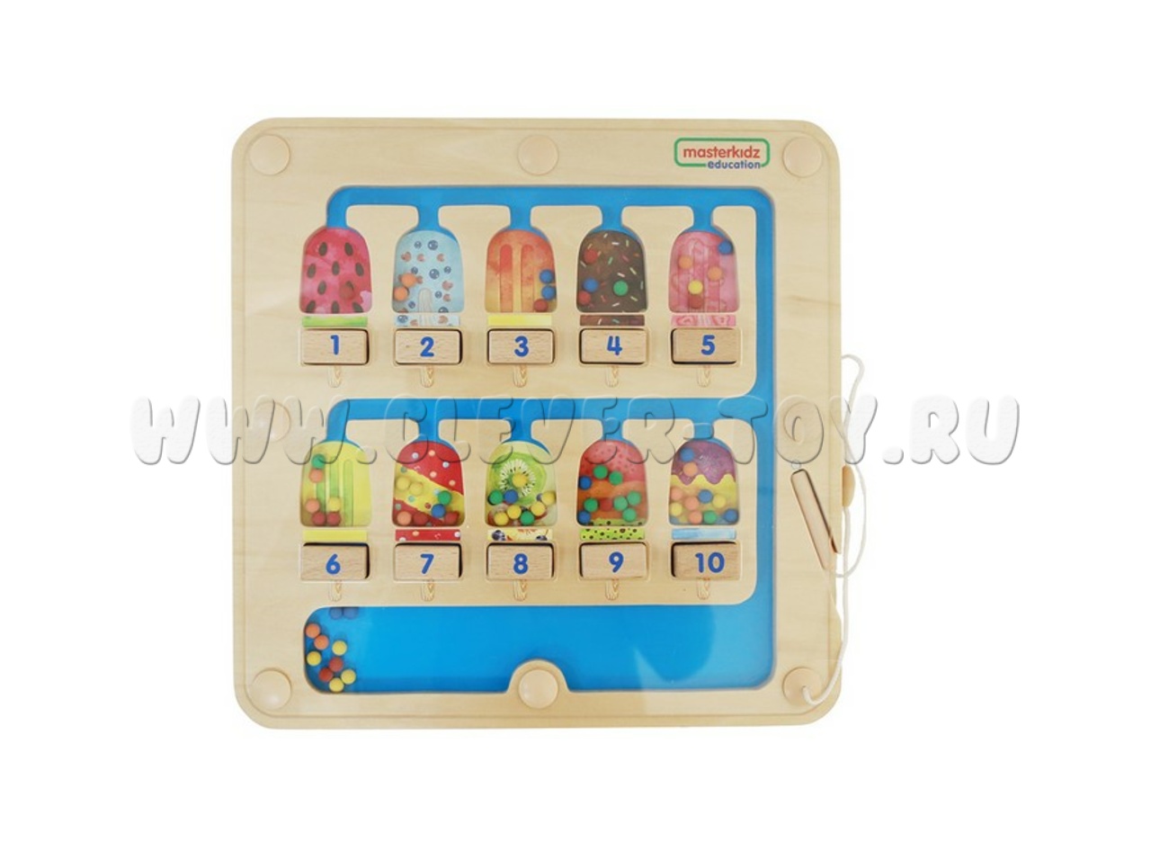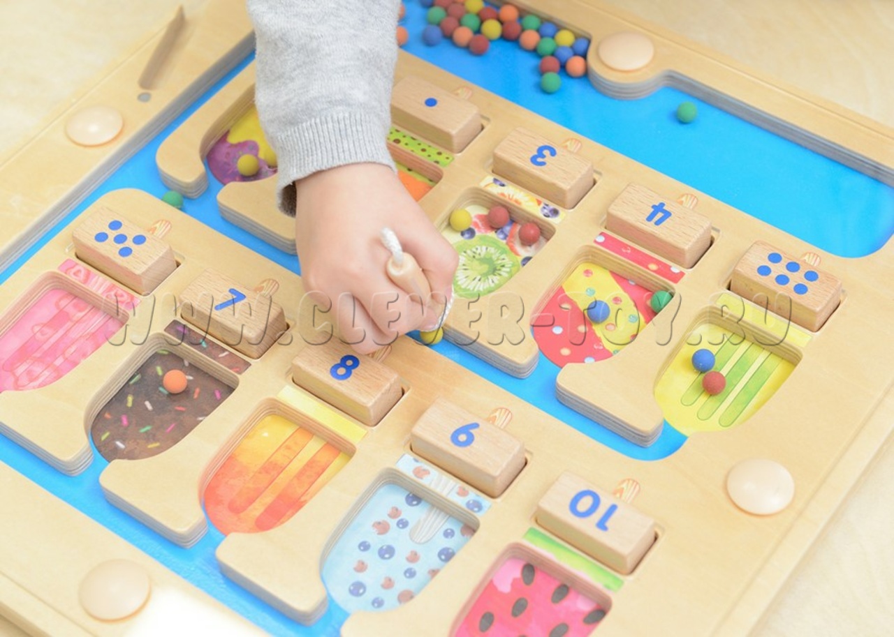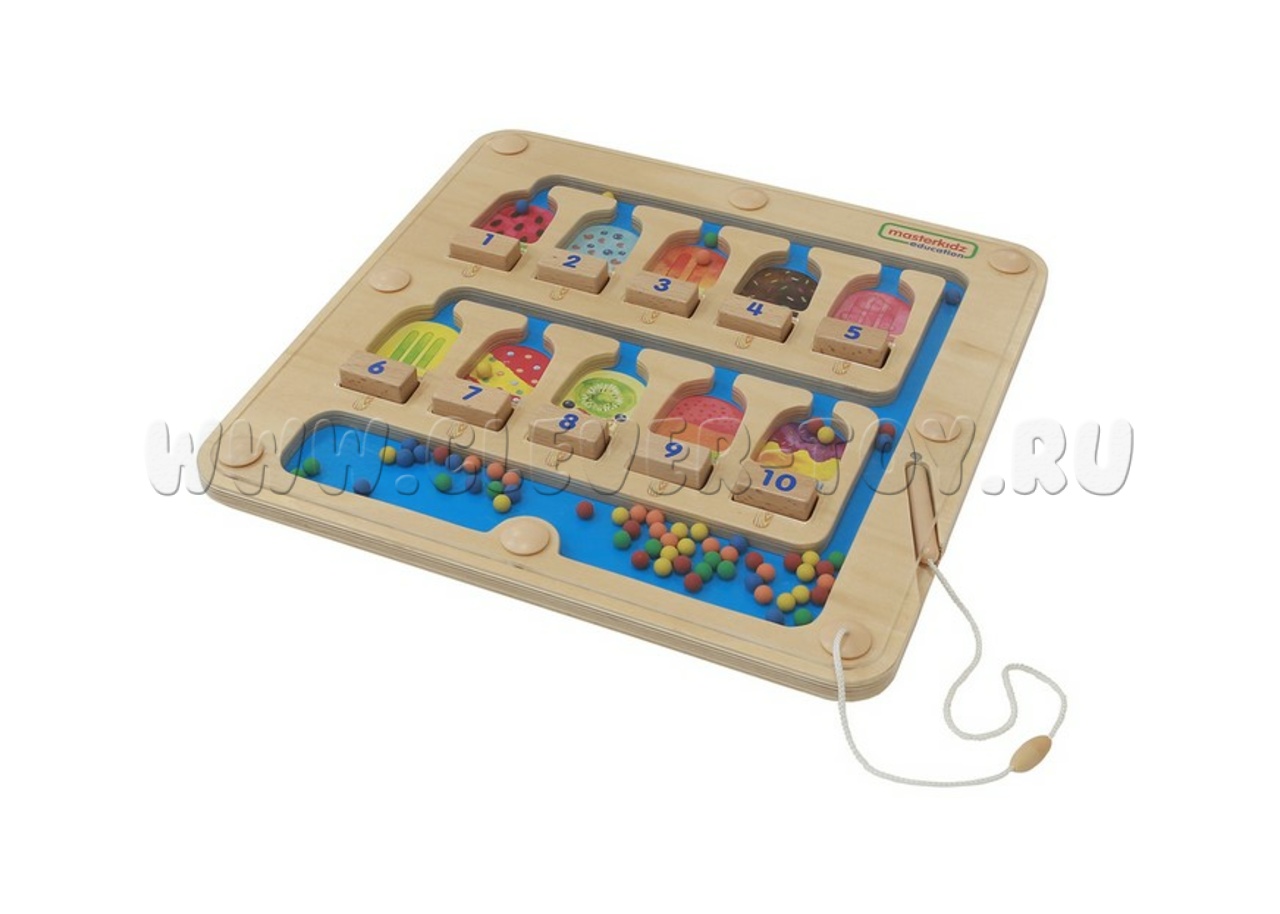 Это магнитный лабиринт с десятью выемками в виде разноцветных эскимо. Под каждым эскимо находится двусторонний деревянный блок: на одной стороне изображена цифра, на другой - соответствующее количество точек. В нижней части панели лежат цветные магнитные шарики. С помощью магнитной ручки, прикреплённой верёвочкой справа, ребёнок перемещает нужное количество шариков в каждое эскимо, ориентируясь на цифру или точки.
