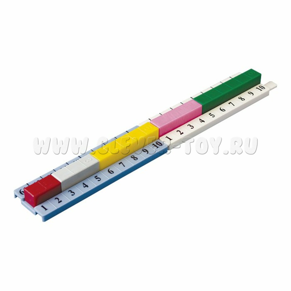 В комплекте 250 пластмассовых призм, которые отличаются по трем признакам: цвету, длине и числу, которое они обозначают. Белые 100 шт., красные 30 шт., серые 20 шт., розовые 20 шт., желтые 20 шт., зеленые 15 шт., черные 12 шт., коричневые 12 шт., синие 11 шт., оранжевые 10 шт. + 5 карточек с заданиями.